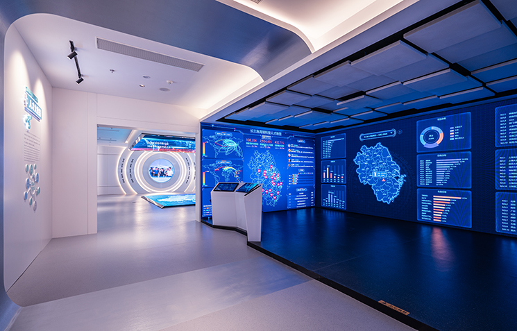 由金螳螂文化擔任設計與施工的浙江長三角人才大廈項目,位于嘉興市南湖區國際金融廣場金融大廈B座的21、22和23層,每層約1700平方米。其中21層是長三角人才項目集聚區;22層是長三角企業集聚區、高校聯合會、協會集聚區;23層是長三角人才數字展示中心、長三角人才會客廳、人才驛站、公共服務信息平臺、嘉興長三角人才發展研究院、運營公司,展廳主要分為兩個區域,功能區和展示區。