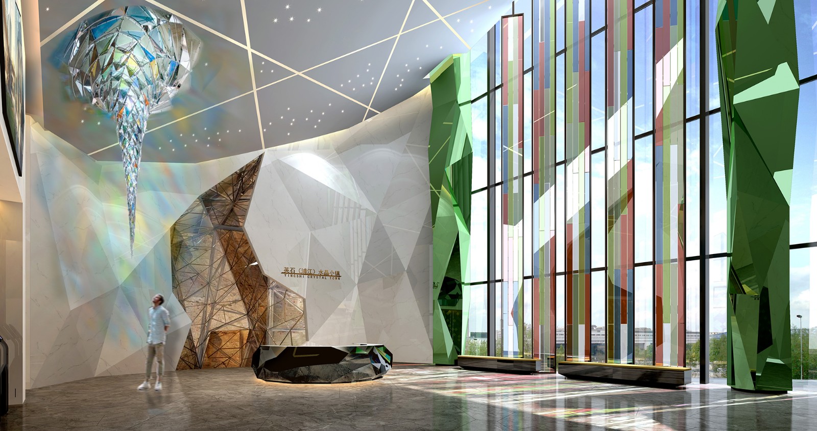 浦江是聞名遐邇的中國水晶之都,水晶小鎮(zhèn)是浦江水晶產(chǎn)業(yè)轉(zhuǎn)型升級的示范區(qū),而小鎮(zhèn)客廳是水晶小鎮(zhèn)之旅的第一站和核心景觀。整個(gè)小鎮(zhèn)客廳集接待、洽談、體驗(yàn)、展示、餐飲、娛樂、休閑等功能于一體,分為地下一層、地上二層,主要設(shè)有服務(wù)大廳、多功能廳(劇場)、水晶小鎮(zhèn)展示廳、水晶藝術(shù)館、DIY紀(jì)念館、水晶博物館、水晶小鎮(zhèn)未來科技體驗(yàn)館、智能指揮中心、英石浦江(辦公室)以及其他配套設(shè)施。建筑總面積約13500平方米,設(shè)計(jì)總面積約12000平方米。