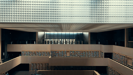 步入文化中心,首先引入眼簾的是坐落于群眾藝術(shù)館和博物館中間的圖書館,從整體造型來看,圖書館恰似一頂巨大的“博士帽”,于文化中心高地公園之上,大氣堂正凜然自威。外立面上旋轉(zhuǎn)漸變的木色百葉、文字肌理的書架墻,圖書館的文化況味在此酣暢淋漓地極盡表達(dá)。