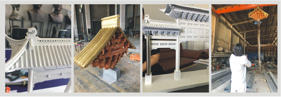 牌樓頂部采用現(xiàn)代材料線框式焊接,通過(guò)藝術(shù)化加工達(dá)到古今碰撞虛實(shí)融合的效果。施工團(tuán)隊(duì)與設(shè)計(jì)師緊密配合,保障了安全有序的現(xiàn)場(chǎng)施工與藝術(shù)裝置的落地。