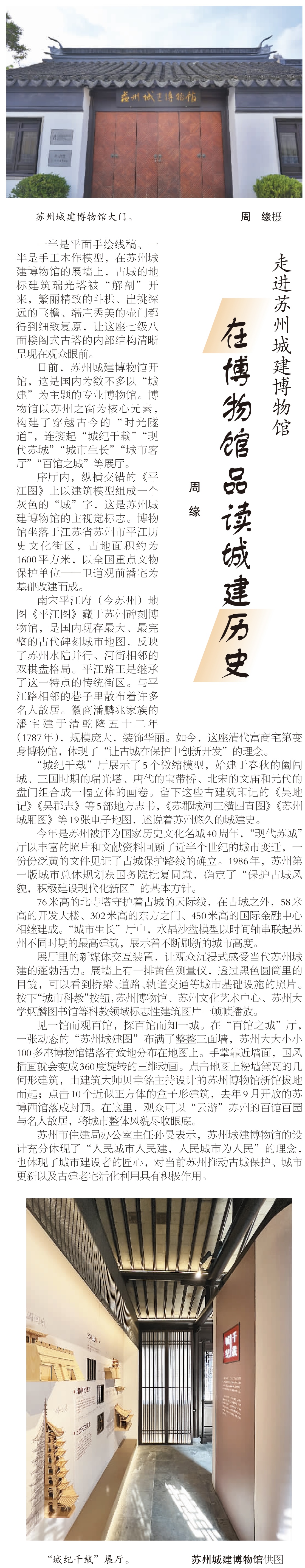 從小橋流水到繁華街市, 從亭臺樓閣到摩天大廈, 從限高24米的古城區出發, 城市天際線不斷延伸, 蘇州城市發展的畫卷徐徐展開。 蘇州城建博物館邀您在平江古宅內, 縱覽姑蘇城市發展脈絡。 7月5日,《人民日報》(海外版)刊發文章《走進蘇州城建博物館——在博物館品讀城建歷史》,介紹蘇州城建博物館的立館初心、設計理念以及展陳內容。 5月18日,蘇州城建博物館正式開館,這是國內為數不多以“城建”為主題的專業博物館。 蘇州城建博物館坐落于江蘇省蘇州市平江歷史文化街區,占地面積約為 1600 平方米,以全國重點文物保護單位——衛道觀前潘宅為基礎改建而成。 南宋平江府 (今蘇州) 地圖 《平江圖》藏于蘇州碑刻博物館,是國內現存最大、最完整的古代碑刻城市地圖,反映了蘇州水陸并行、河街相鄰的雙棋盤格局。 平江路正是繼承了這一特點的傳統街區。與平江路相鄰的巷子里散布著許多名人故居。徽商潘麟兆家族的潘宅建于清乾隆五十二年(1787年),規模龐大,裝飾華麗。如今,這座清代富商宅第變身博物館,體現了“讓古城在保護中創新開發”的理念。 以蘇州之窗為核心元素,蘇州城建博物館構建了穿越古今的“時光隧道”,連接起“城紀千載”“現代蘇城”“ 城市生長”“城市客廳”“百館之城”等展廳。 步入序廳,墻壁上由平江圖縱橫阡陌的街巷格局衍化而來的城建博物館LOGO映入眼簾,以及極具意蘊的序言,營造出一種古色古香、厚重深廣的第一視覺印象。 一半是平面手繪線稿、一半是手工木作模型,城紀千載廳,古城的地標建筑瑞光塔被“解剖”開來,繁麗精致的斗栱、出挑深遠的飛檐、端莊秀美的壺門都得到細致復原,讓這座七級八面樓閣式古塔的內部結構清晰呈現在觀眾眼前。 源浚者流長,根深者葉茂。一個城市的歷史遺跡、文化古跡、人文底蘊,是城市生命的一部分。現代蘇城廳以文物陳列結合影像記錄的方式,講述蘇州近現代城建改造與保護的故事。呈現蘇州歷代城建人在老城區改造的同時,也在有意識、有目的的保護歷史遺跡、改善人居環境,延續城市文脈,使歷史故居和當代建筑相得益彰。 城市生長廳以影像采訪和榮譽陳列的形式,記載了為現代蘇城建設貢獻智慧與辛勞的勞模與集體。而地下管廊、建筑屋頂、抗風避震這樣的微創新技術縮模型則體現著蘇州城市建設中的當代智慧。 從1986年建成的開發大樓開始,一座座現代高樓拔地而起。城市生長廳正中以“城市生長”的互動展項串聯起蘇州不同時期的最高建筑,不斷升高的建筑天際線也象征了蘇州城市不斷發展的新高度。 城市會客廳整體保留了潘宅正廳——禮耕堂的建筑格局,抬頭可為清代四大書法家之一的梁同書所書的“禮耕堂”三字。 中堂設計以潘宅磚雕門頭為原型,借用唐代杜荀詩句鶴送人游吳,集字唐寅書法,采用漆畫工藝制作。整個大廳結構規整,氣勢恢宏,為清乾隆時期具有代表性的建筑作品。一磚一瓦,一草一木,觸手可及三百年的滄桑變換。 一灣碧水護城安,兩岸美景入畫來。百館之城廳是一張可以通過觸摸交互觸發的手繪版“現代蘇州城建圖”,蘇州現存的103座博物館、169處市級控保建筑、65處各級文保單位,在這里,可以通過觸摸來感知深厚的蘇城的厚重歷史。 “城市”是一個大型的人類聚居地,是承載人類進步和發展的載體,是人類文明的鮮明標志,讓城市生活更美好,是城市建設、發展、治理的價值所在。 方寸之間,匯聚蘇州城建縮影。“人民城市人民建,人民城市為人民”,城建博物館是蘇州城建文化價值的縮影,承載著蘇州過去的厚重歷史,匯聚著對蘇州未來發展的美好愿景,將成為蘇州城建精神風貌的展示窗口與文化地標。
