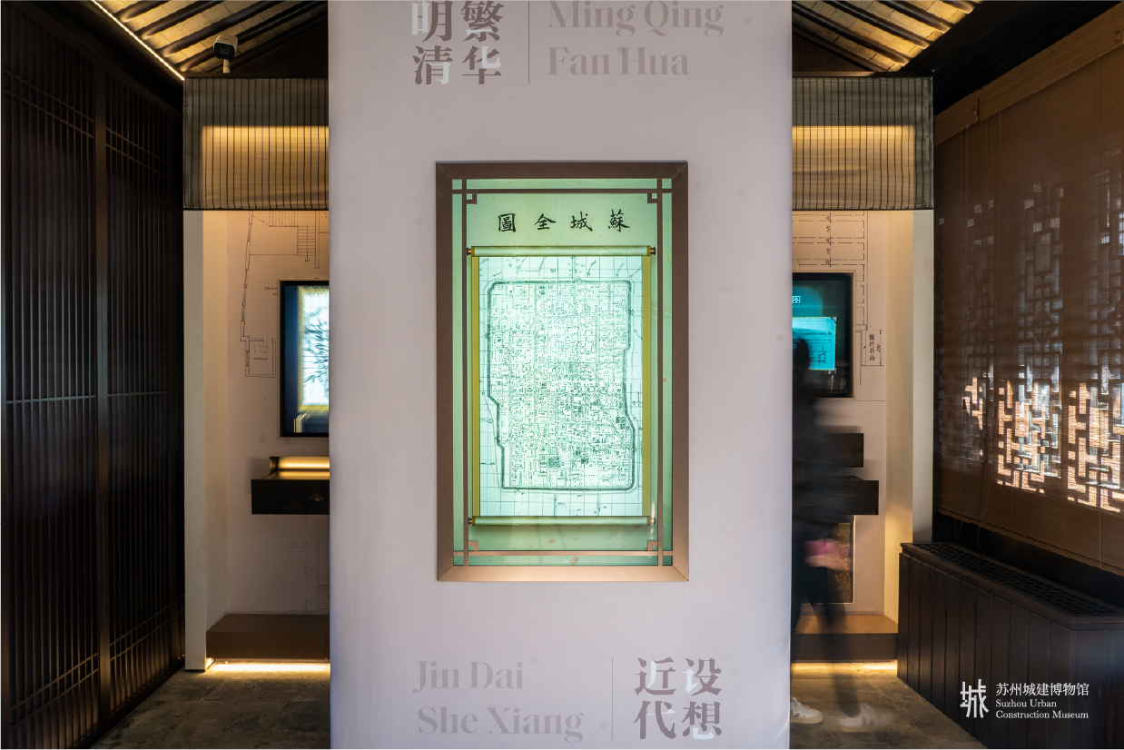 建館、造景、養心,于平江古巷里,把握城市生長脈絡。金螳螂文化項目團隊以蘇州之窗為核心元素構建了穿越古今的時光通道,貫穿起蘇州城建博物館城紀千載、現代蘇城、城市生長、城市客廳、百館之城等主要展廳。
